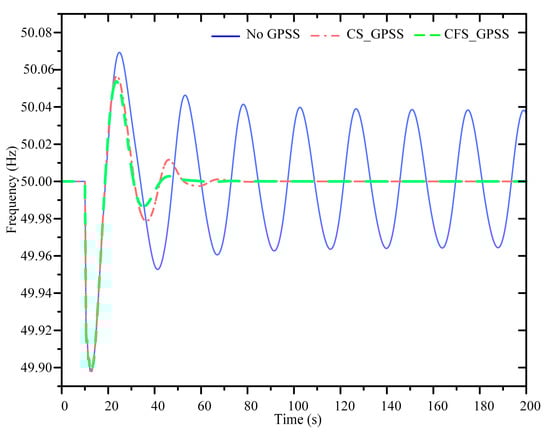 In Figure 8, the frequency response is obtained using the CS_GPSS, the CFS_GPSS, and without a GPSS when the 0.2 Hz step disturbance is applied to the simplified single-machine system shown in Figure 1. Compared to no GPSS and the CS_GPSS, the CFS_GPSS significantly improved the performance of PFR by substantially reducing power overshoot, shortening the settling time to 60 s, and minimizing oscillations during regulation.