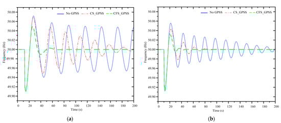 It can be seen from Figure 12a that a ULFO of 0.034 Hz occurred in the system when the hydropower output decreased. The CS_GPSS method exhibited inadequate suppression effectiveness, with a steady time and number of oscillations of approximately 90 s and four cycles, respectively. In contrast, the CFS_GPSS method achieved regulation within 50 s and demonstrated minimal oscillations. Compared to the CS_GPSS, the CFS_GPSS significantly enhanced the damping level and effectively suppressed the system oscillation. This conclusion aligns with the theoretical analysis presented in Figure 7. Figure 12b shows that the system had a ULFO of 0.054 Hz when the hydropower output increased. It is noteworthy that both control strategies effectively mitigated the ULFO, with the CFS_GPSS demonstrating a more pronounced suppression effect in this particular case. Specifically, the steady time of the system was reduced to 50 s, resulting in approximately two cycles of oscillations and a decrease in oscillation amplitude.