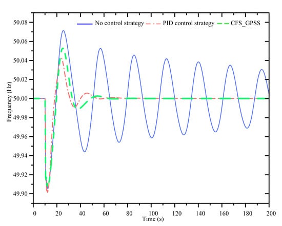 In order to assess the PFR performance of PID parameter optimization and the CFS_GPSS control strategy, a further investigation was carried out in operating condition 1. Firstly, it was assumed that both control methods exhibited similar oscillation suppression effects. Secondly, a comparative analysis of the PFR performance between the two control methods was conducted.