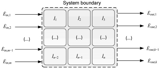 Generic system boundary with m inlet and k outlet exergy flows (material streams, power, and heat) as well as n individual irreversibility components inside the control volume.