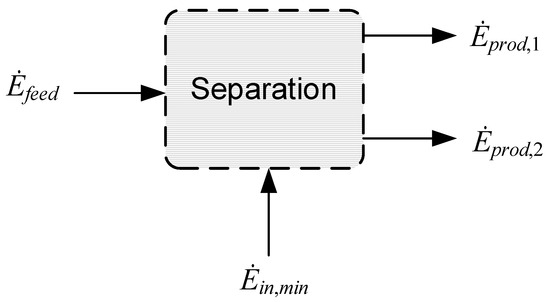 Processes such as separation, liquefaction, or compression have defined tasks that involve bringing about a desired change for one or more defined feed streams into one or more product streams. The feed and product streams are in turn defined by properties such as the flow rate, temperature, pressure, and chemical composition. Before considering an actual process layout and assessing its performance, the minimum exergy requirement, , can be calculated based on the exergy flows of the defined feed and product streams. A reversible separation process with one feed stream with exergy flow and two product streams with exergy flows and is used as an illustration in Figure 3. What is also indicated is the inward-directed exergy flow, denoted as . Assuming the process is reversible, Equation (6) applied to the control volume reduces to the following: