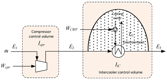By including a portion of the environment in the control volume, the external irreversibilities can be internalised [38]. By doing so, all elements of exergy destruction occurring inside the heat exchanger due to heat transfer and pressure drop, as well as the additional dissipation of pumping power and the rejection of waste heat from the water to the environment, can be included. In this case, the total irreversibility for the inter-cooling stage can be expressed as follows: