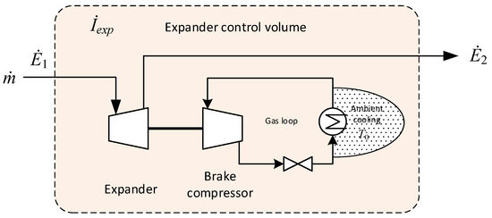 The expander used in the low-temperature tail gas separation process (see Section 4) is not used to recover power, but to induce a temperature drop in the gas stream. In the absence of an electric generator, the expander is coupled to a brake compressor through a shaft in order to transfer and dissipate power. The transferred power is used to compress gas in a closed loop that includes a throttling valve and a cooler located outside the coldbox rejecting heat to the ambient surroundings. As for the intercooler in Figure 4, the control volumes of the expander and brake compressor in Figure 5 also extend into the environment so that all exergy transferred to the brake gas loop is eventually accounted for as irreversibilities. Based on these assumptions and the stream numbering in Figure 5, the irreversibility of the defined control volume can be expressed as follows: