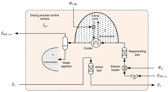 The regeneration process consists of different modes of operation, such as depressurisation, heating, regeneration, cooling, and repressurisation, all with different durations and dependent on the exact design and procedures of the drying process. As one example, the electric heater is active only during the removal of water in the regenerating bed. After the solid desiccant has been regenerated, the recycled gas stream will still be flowing through the regenerating bed, but now with the heater switched off so that the packing material is cooled down before switching to the active mode. A consequence of this is that the flow of rejected water will be present only in certain periods of operation. Due to the batch nature of the regeneration process, the representation of the flow of energy and matter is provided in time-averaged terms. Using average values, the exergy balance for the control volume in Figure 6 can be expressed as follows:
