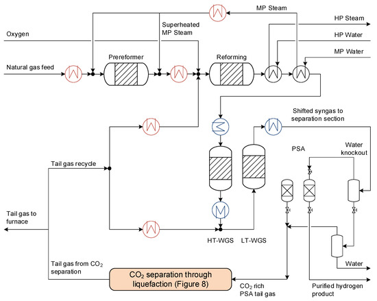 Process flow diagram for the hydrogen production process based on an autothermal reformer, two water–gas shift reactors, and a PSA unit for hydrogen separation and purification. The sub-process “CO2 separation through liquefaction” is explained in detail in Section 4.2. Coolers are represented in blue while heaters are shown in red. The reader is referred to the web version for the colour coding.