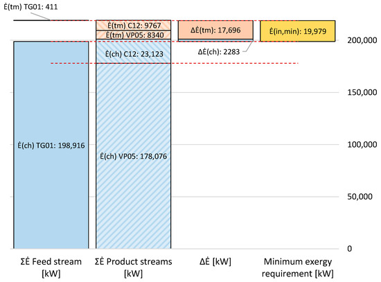 In Equation (1), equals the total irreversibility rate as the sum of internal exergy destruction () and external exergy losses (), and is defined as the “total fuel exergy of the system”. As discussed and exemplified in previous publications, such as [34], there are different ways to define and assess exergy efficiency from the exergy balance of processes. In [3], it is argued that a rigorous definition of exergy efficiency is the ratio between the minimum exergy requirement, , and the actual exergy input to the process, :