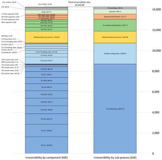 So, it is possible to calculate the overall process irreversibility rate in two independent ways, and it is possible to verify the consistency of irreversibility calculations by comparing these two numbers [36,37]. An element generally lacking in exergy analyses presented in the literature is the checks and balances provided by a transparent comparison of the total irreversibility rate calculated by the top-down and bottom-up expressions, as provided in Equations (6) and (7), respectively.
