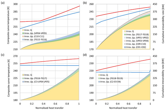 Irreversibilities caused by pressure losses, , are calculated for each individual process stream. The sum of pressure loss-related irreversibilities for a heat exchanger with n process streams can be expressed as follows [37]: