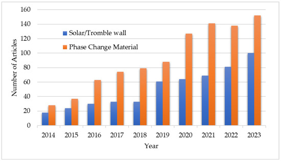 Trends in published articles by year on Trombe walls and phase-change materials from 2014 to 2023 [53,54].