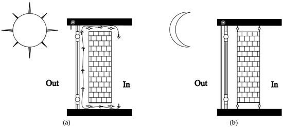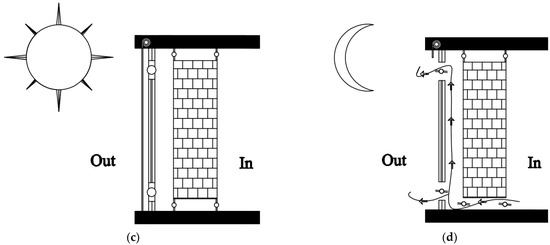 Illustration of the operational modes of a TW as follows: (a) winter (daytime periods); (b) winter (nighttime periods); (c) summer (daytime periods); and (d) summer (nighttime periods) [63].