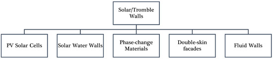 In the following, various types of SWs are examined and classified into five distinct groups based on their fundamental technologies and design features, as illustrated in Figure 4. The first category encompasses PV solar cells, where photovoltaic cells are integrated into the wall to directly convert solar energy into electricity. The second group consists of solar water walls, where water is utilized as a heat absorbent to capture and convey solar energy. The third category includes PCMs, incorporating materials capable of storing and releasing energy during phase transitions. The fourth group comprises double-skin facades, featuring an outer layer that shields against environmental elements while facilitating controlled ventilation. Lastly, the fifth category encompasses Fluid Walls, incorporating fluid-based systems for the absorption and distribution of solar heat, providing a versatile approach to solar energy utilization in building design.