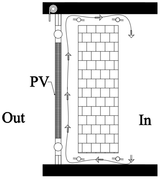 Managing high temperatures presents a significant challenge for SW systems, especially in hot and sunny climates. Traditionally, SWs have been utilized for passive heating, involving the absorption of solar radiation and the transfer of heat into buildings through natural convection. However, in extremely hot conditions, this approach can lead to overheating, resulting in reduced comfort and energy efficiency. To tackle these challenges, the integration of PV solar cells into SW designs has been explored (Figure 5). This integration seeks not only to utilize SWs for passive heating but also to generate electricity from solar energy. This strategy optimizes resource utilization and significantly enhances overall system efficiency [75,76]. The incorporation of PV solar cells into SWs has spurred innovative research efforts aimed at improving energy generation and thermal performance.