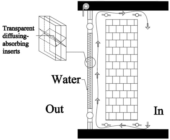 According to Figure 6, the remarkable specific heat of water, more than four times that of masonry, is very valuable for heat storage. However, its use is cumbersome because waterproof containers are required. Transparent glass containers filled with colored water and biocides act as translucent barriers. Absorbent glass and semi-transparent components provide structural support and regulate sunlight transmission. This is addressed by employing protective measures, including the use of glazing and shading devices, to regulate solar radiation and prevent excessive heat absorption. These components act as barriers to control the entry of sunlight, ensuring a balanced thermal environment within the system.
