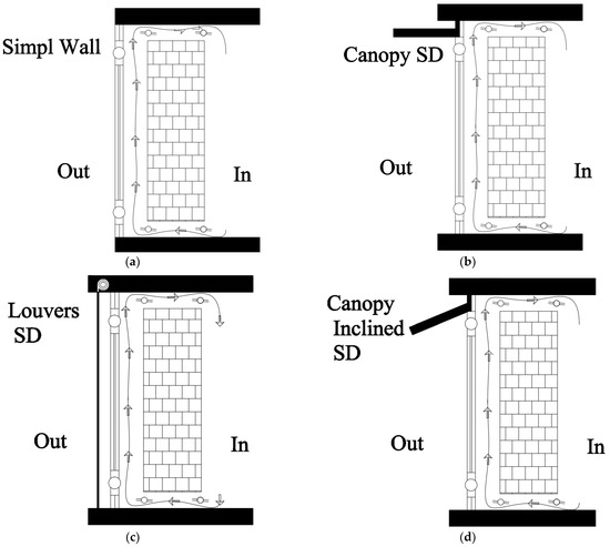 The effectiveness of TWs is further enhanced by strategically placed air vents [68]. These vents, located at both the base and the top of the massive wall, serve to reduce heat loss to the external environment. They facilitate air movement through thermos-circulation, eliminating the need for mechanical ventilation [69]. Warmer air rises and enters the interior space through upper openings, while cooler air exits through lower openings, creating efficient air circulation. However, in cases where air layer temperatures rise significantly, there can be increased heat loss through the glazing. To counteract this, the management of air vents should be adjusted based on local weather conditions and desired indoor temperatures [70]. Considering TWs’ primary role in passive heating, precautions are necessary to prevent overheating in the summer [71]. External shading or occlusion devices can help, and the use of air vents in both the massive wall and glazed surface, as seen in the Double-ventilated TW (DVTW) (Figure 3), can aid in cooling the air layer. Achieving the desired indoor temperature involves optimizing the TW design and effectively managing air vents and shading devices (SDs) [63]. During winter daytime periods when ample solar radiation is present, it is advisable to have the air vents located on the glazing surface and to keep the massive wall closed. This closure results in the establishment of an air layer greenhouse effect, leading to increased indoor temperatures. The use of shading devices during this time is not recommended to maximize the absorption of solar heat. The activation of the ventilation system within the massive wall should only occur when the temperature in the air layer exceeds that inside the room and there is a need for space heating, as illustrated in Figure 3a. During nighttime in the winter, keeping the air vents and shading devices closed is the preferred course of action to prevent heat loss from the interior to the outside environment, as shown in Figure 3b. In the summer, during daylight hours, it is essential to have the ventilation system closed and make use of shading devices. It is worth noting that the effectiveness of solar gains decreases as the shading device becomes opaque, and using a lighter-colored shading device enhances the reflection of incident solar radiation, as depicted in Figure 3c. During nighttime in the summer, it is advantageous to have the air vents on the glazing surface and to keep the shading devices open to facilitate the cooling of the air layer. In this scenario, a DVTW can contribute to cross-ventilation within the building. By opening the vents at the bottom of the massive wall and those at the top of the glazing, hot air circulates within the building. Openings on the opposite north-oriented facade allow for cross-ventilation, effectively cooling the internal spaces, as illustrated in Figure 3d. During winter days with abundant solar radiation, it is advisable to close the air vents on both the glazing and the massive wall to create a greenhouse effect in the air layer, raising temperature levels [72]. SDs should not be used to maximize solar gains [73]. The massive wall’s ventilation system should only be activated when the air layer’s temperature exceeds that of the interior and heating is required [74]. During nighttime, closing the air vents and the use of SDs prevent heat loss from inside to the exterior [64].