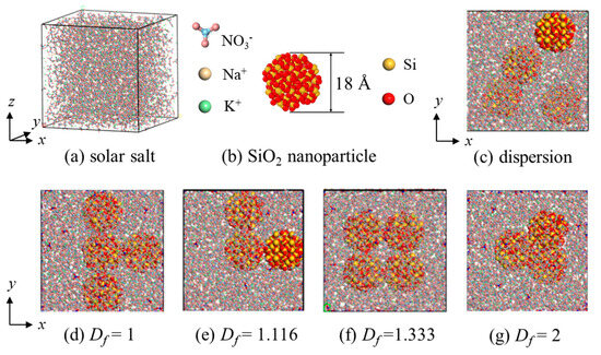 The model of solar salt is shown in Figure 1a. Following the density of solar salt (NaNO3:KNO3 = 60:40 wt.%) of 1.9 g/cm3 [27], Na+, K+, and NO3− ions were randomly filled in a cubic box with a side length of 55 Å, which is large enough to avoid the finite size effect [28]. Due to the limitations of computer resources, four spherical SiO2 nanoparticles with a diameter of 18 Å were created, as shown in Figure 1b. Nanoparticle diameters around 2 nm have been used in previous MD simulations [29,30]. The nanoparticles were randomly filled in the solar salt box to obtain a dispersed nanofluid, as shown in Figure 1c. Then, nanoparticle aggregates with different fractal dimensions were created. Figure 1d–g shows aggregated nanofluids under 8 wt.% loading of nanoparticles. The fractal dimension (Df) represents the tightness of nanoparticle aggregation, which is given by Equation (1) [23].