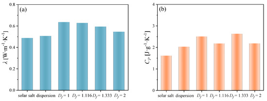 Figure 2b shows the specific heat capacities of solar salt, dispersed nanofluid, and aggregated nanofluids with different fractal dimensions at 573.15 K. The specific heat capacity of solar salt at 573.15 K is determined to be 1.610 J·g−1·K−1, which is close to the experimental value of 1.648 J·g−1·K−1 obtained in the literature [47]. As shown in Figure 2b, the specific heat capacity of nanofluids is increased compared to solar salt, whether adding agglomerated or dispersed nanoparticles. However, the fractal dimension of nanoparticle aggregates is not directly related to the specific heat capacity, which is different from the monotonous dependence of thermal conductivity on the fractal dimension.