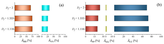 It is found that the contributions of crossed correlations are small, which has also been reported in Cu–Ar nanofluid [49]. Therefore, Figure 3a only shows the contributions of nanoparticles and base liquid to thermal conductivity due to self-correlations. It can be seen that the contribution of base fluid is about 70%, which is much larger than aggregated nanoparticles. In addition, the contribution of base fluid decreases with the increase of fractal dimension. As the fractal dimension increases from 1.116 to 2, the contribution of λBB decreases by 6.95%. This tendency is consistent with the thermal conductivity shown in Figure 2a. It indicates that the base liquid dominates the heat conduction of aggregated nanofluids.