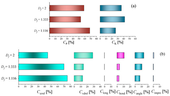 To reveal the physical insights of specific heat capacity, the effects of different energy components on the specific heat capacity of the nanofluid were explored. The contributions of kinetic and potential energy to the specific heat capacity were calculated first. The results are shown in Figure 4a. We can see that the contribution of potential energy is larger than that of kinetic energy. We further decomposed the contribution of potential energy to the van der Waals Cvdwl, short-ranged part of coulombic interaction Ccoul, long-ranged part of coulombic interaction Clong, bond Cbond, angle Cangle, and improper Cimpro potentials, as shown in Figure 4b. It can be seen that the ranking of contribution is Clong < Cimpro < Cbond < Cangle < Cvdwl < Ccoul. The contribution of Ccoul is the largest and negatively correlated with the fractal dimension. As the fractal dimension increases from 1.116 to 2, the contribution of Ccoul decreases by 30.17%. Differently, the specific heat capacity changes with fractal dimensions are irregular. The correlation between specific heat and the variation in the contribution of different energy compositions needs to be further explored. We hope that our findings can stimulate interest in studying the relationship between the specific heat and energy composition contribution.