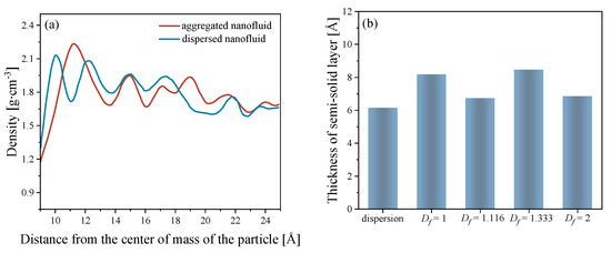 The density distribution of ions around the nanoparticle was further calculated and is shown in Figure 5a. As can be seen, the first peak of density is the greatest, then the other peaks weaken. This indicates that the addition of nanoparticles results in a strong attraction between nanoparticles and the base liquid, leading to the formation of a semi-solid layer. Destroying the microstructure of the semi-solid layer requires energy, thus increasing the specific heat capacity of the nanofluid. The thickness of the semi-solid layer is measured from the first peak to the third trough [51] of density distribution. Figure 5b shows the thickness of the semi-solid layer around dispersed nanoparticles and aggregated nanoparticles. We can find that the thickness of the semi-solid layer around agglomerated nanoparticles is greater than that around dispersed nanoparticles. In addition, the quantitative relationship of the semi-solid layer thickness shown in Figure 5b is consistent with the specific heat shown in Figure 2b. It verifies that the semi-solid layer is related to the specific heat. However, the quantitative relationship of semi-solid layer thickness does not correspond to the thermal conductivity. This indicates that the change in heat conduction of aggregated nanofluids cannot be explained by the semi-solid layer. Similar results have been found in dispersed nanofluids [29,30].