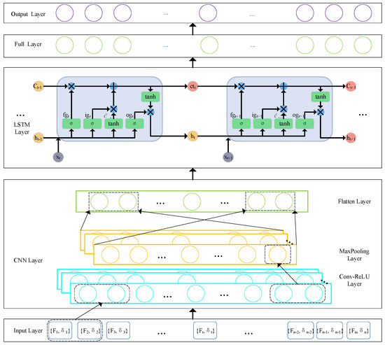 In the paper, the spatial features of (F, δ) are extracted by CNN, and the time characteristics of the input data (F, δ) are extracted using LSTM. The structure of the used CNN-LSTM network is shown in Figure 1.