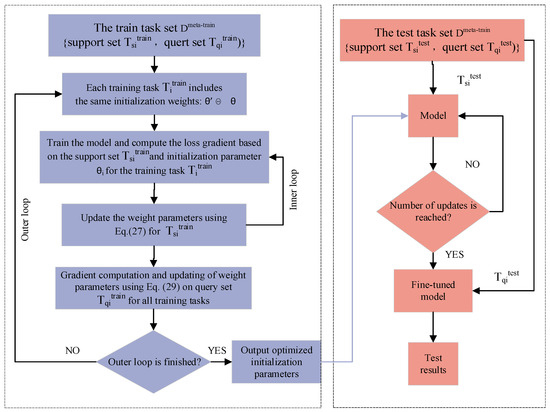 In this phase, the optimized parameters and model obtained in the meta training stage are finetuned through . The parameters in the model are updated again through Equation (30) to obtain the final :