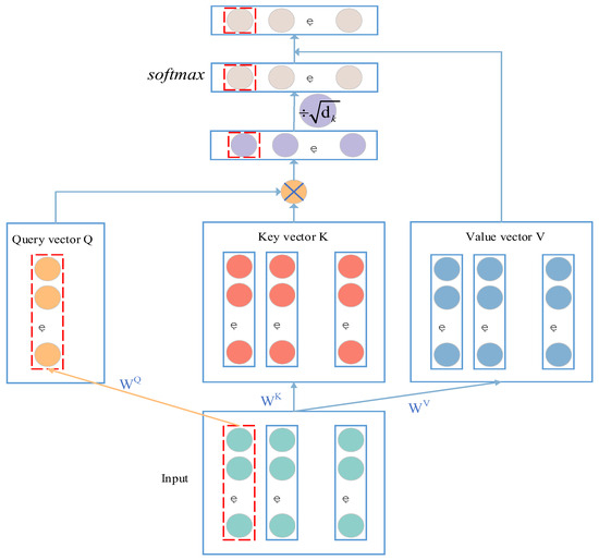First, each input is linearly mapped to three different spaces. For the entire input sequence S, the query vector Q, key vector K, and value vector V are obtained through a linear mapping matrix [33]. The mapping process is illustrated below: