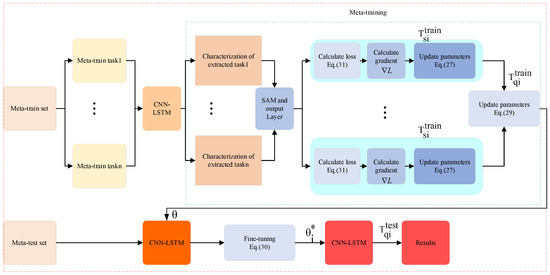 During the meta-training phase, spatio-temporal features are extracted from each training task using CNN-LSTM. These feature vectors are input into the self-attention layer, and are weighted and rearranged for each task through a self-attention mechanism that excels at capturing the interrelationships between elements. This process optimizes the feature representations for each task, and the resulting optimized feature representations are utilized to update the model parameters in the subsequent two stages. In the first step, leveraging the support set data, the model parameters are adjusted at the individual task level according to Equation (27) for rapid adaptation to the new task. In the second step, using the query set data, the learning results from multiple tasks are aggregated to further optimize the initial model parameters through Equation (29). After two gradient updates, MAML can learn the optimal initialization weights during the meta-training phase. This enables the model to achieve improved results not only on individual tasks but also across all tasks, facilitating enhanced generalization even in the face of unknown tasks.