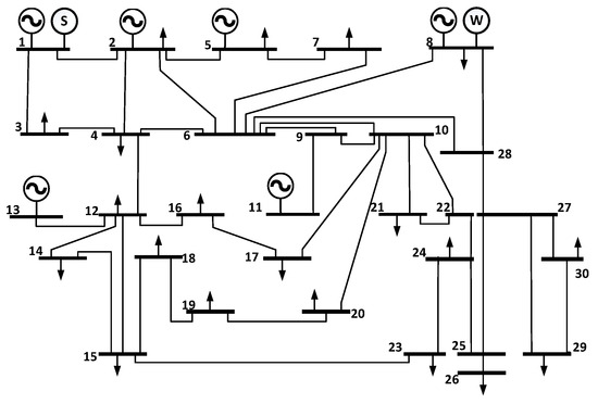 This article employs a modified IEEE 30-node system for simulation analysis. The system includes six conventional, coal-fired thermal power generators, a wind farm located at node 8, a battery storage system, and multiple electric loads, as depicted in Figure 5 (