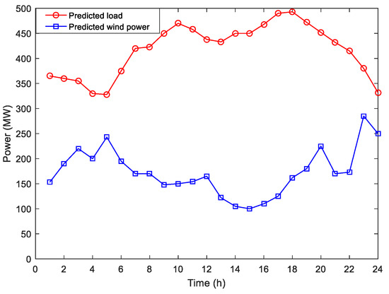 represents the battery storage system). The battery storage system is configured similarly to the largest energy storage project in China, featuring a capacity of 100 MW/400 MW·h. The parameters of thermal power units are taken from reference [35]. The 24 h load forecasting curve and wind power forecasting curve are shown in Figure 6. The time step is 1 h, during which power generation and load are considered constant.