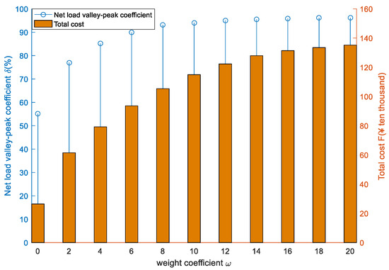 When the weight coefficient is less than the lower limit of the solution range, it may be appropriate to assume ω = 2.73. Although the total system cost is below 800,000 CNY, the net load valley–peak coefficient is 79.97%, and does not meet the requirements of the peak load shifting indicators. As the larger the value of ω, the better the peak load shifting effects, when ω is less than 2.73, the net load valley–peak coefficient will not meet the indicator requirements set by the operator.