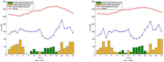 Assume that the system operation indicators set by the operator are as follows: the net load valley–peak coefficient is above 80%, and the total daily operating cost is below 800,000 CNY, i.e., (F, δ) = (800,000, 80%). Inputting this into the trained MAML-SAM-CNN-LSTM network, the weight coefficients that meet the requirements can be directly obtained, which is a range described in [2.74, 4.09]. The changes in the system net load, actual output of the wind farm, and the energy storage power when the weight coefficients are taken from both ends are shown in Figure 8.