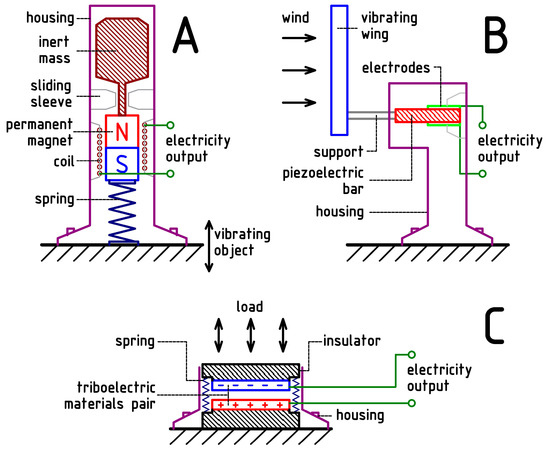Source energy is most often mechanical, thermal, or electromagnetic energy. Chemical and nuclear energy can also be analyzed as source energy, although this is rarely encountered in publications on energy harvesting [6]. The mechanical energy of the source can take various forms, which implies various technical solutions of harvesters. Directed movement is utilized in, for example, vehicles, water, or air. Another form of energy is derived from wave movement, especially of seas and oceans. Mechanical vibrations, for example of technical objects such as bridges and viaducts, may also be processed. The harvesting process also considers the use of pressure waves, for example noise generated by vehicle traffic. To convert mechanical energy into electric current, one of three method types is most often used: electrodynamic, piezoelectric, or, recently, more and more often, triboelectric.