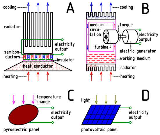 It is also possible to generate electricity from one thermal source, the temperature of which changes over time. The pyroelectric effect is used here, which involves the generation of an electromotive force in some crystals due to a change in temperature. Some piezoelectric materials also have pyroelectric properties [14]. The structure of a pyroelectric harvester is schematically shown in Figure 2C. One of the significant problems in the use of thermal energy for harvesting purposes is the significant thermal resistance between the source and the harvester that occurs in typical applications. This problem is subject to constant research, and progress may be brought by the development of material technology and innovative designs of heat exchangers and conductors.