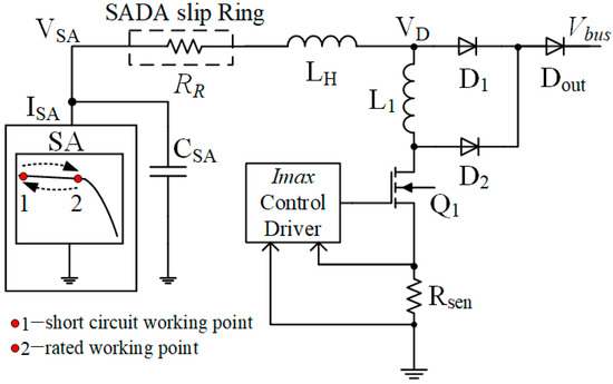 Figure 4b. In switching mode, the SR switches between the bus feeding mode and shunt mode, thus modulating the power delivered to the bus, and the working point of SA switches between the two points correspondingly.