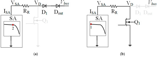 Figure 4a. In shunt mode, the SR shunts all the power from the solar array to ground, and the SA operates at the short circuit working point (point 1), as shown in