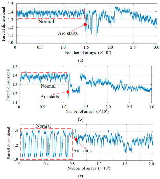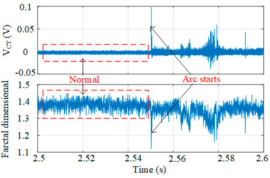 Figure 8c. During the steady-state operation, the fractal dimension changes periodically and regularly. When an arc fault occurs, the periodic change is interrupted and the dimension is concentrated between 1.2 and 1.3.