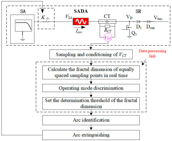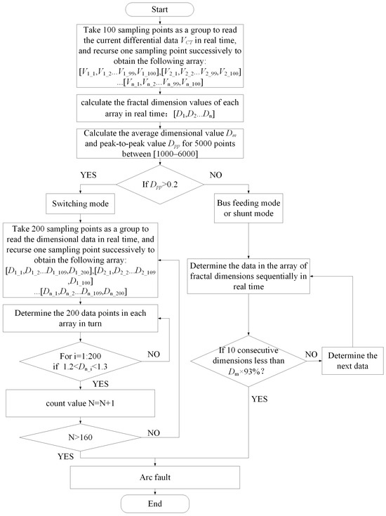 The flow of the SADA arc fault detection procedure based on fractal dimension and arc identification algorithm is shown in