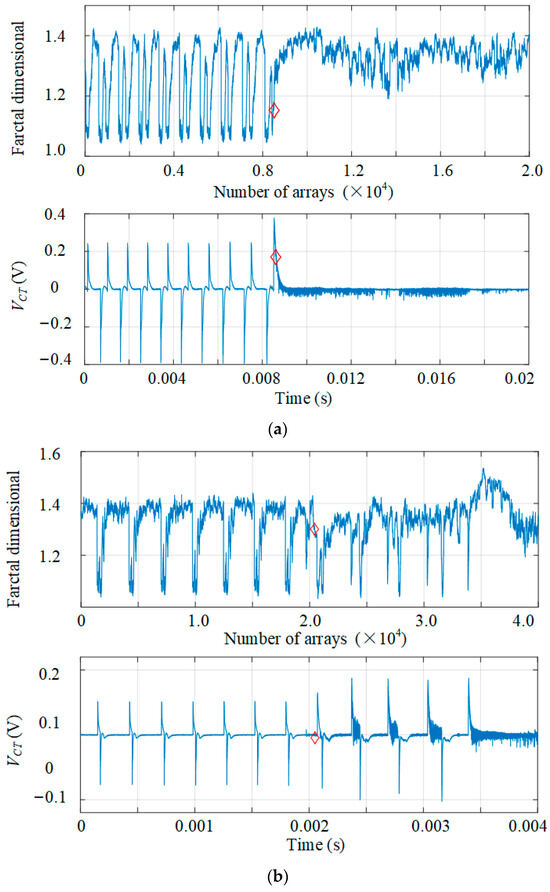 VCT. The figure above shows the real-time fractal dimension, which corresponds to an array of 100 data (100 μs) recursively forward at each moment of sampling. The red diamond marker points to the arc fault identification moment.