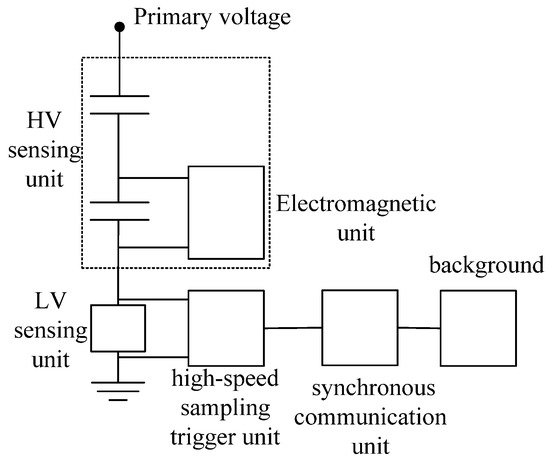 The capacitive voltage divider (CVD) used in these tests has been designed for measuring high-frequency fault transients across various apparatuses like power transformers, instrument transformers, switchgear, breakers, and HV cables. It adheres to all the requirements outlined in IEC 60060-2, particularly in terms of measuring accuracy and step response. This ensures high reliability and robust voltage sensing, minimizing interference. The inductive-free broadband sensing unit connects the medium-voltage capacitor and the ground to create a high-voltage capacitive voltage divider [21]. Figure 1 illustrates the structure of this equipment. The monitoring device’s 3 dB cutoff frequency is higher than 200 kHz, which can respond to lightning voltage impulse responses and transient overvoltage with a microsecond-order rising time.