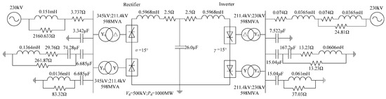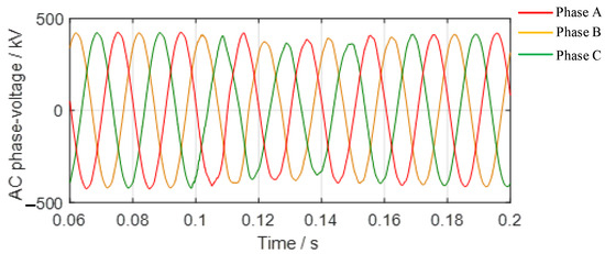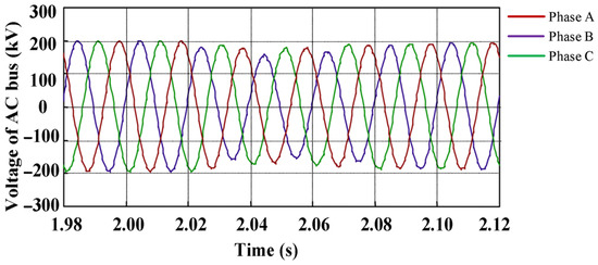 A standard CIGRE HVDC test system is depicted in Figure 6. The AC system in the inverter station has a short-circuit ratio of 2.5. In the event of a single-phase grounding fault in the AC system, the converter station’s bus voltage undergoes significant distortion, distinguishing it from the measured fault voltage waveform. Typically, China’s HVDC transmission systems feature a robust AC power grid on the inverter side, with a substantial short-circuit ratio. To enhance the generalizability of our research findings, we made a slight adjustment to the AC system model on the inverter side of the standard CIGRE HVDC test system: specifically, the removal of the 36.5 mH series inductance in front of the inverter-side power supply. The Short Circuit Ratio (SCR) of the inverter is the ratio of the short circuit current of the output voltage of the inverter to the rated output current. Following this modification, the SCR of the AC system on the inverter side became 5. Under the same ground fault scenario, the key characteristics of the inverter station’s AC bus voltage, illustrated in Figure 7, closely resemble the features of the measured fault voltage waveform (Figure 3).