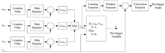 - Using data registers to store the waveform data from the previous cycle, perform a differential operation between the current waveform data and the previous cycle’s data to calculate the absolute difference of the inter-phase voltages in the current cycle and the previous cycle, denoted as , , and . Then, determine the maximum value among these three voltage disturbances, denoted as .