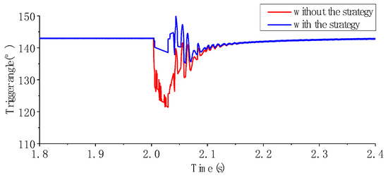 When the fault reactance was 0.24 H and the fault time was set to 2.002 s, the start time of the prediction step was 2.00375 s, and the maximum output was 0.32 rad. Figure 9 illustrates a comparison of the arc extinction angle behavior of the CIGRE HVDC standard test system before and after the introduction of this prediction step. Before implementing this prediction step, the arc extinction angle started to decline at 2.00475 s, dropped to zero at 2.009 s (where the DC system experienced commutation failure), and began to recover after 395 ms. After introducing this prediction step, the arc extinction angle also started to decline at 2.00475 s but reached a minimum value of 11.26° at 2.006 s and began to recover after 165 ms. Figure 10 shows a comparison of the trigger angle behavior of the CIGRE HVDC standard test system before and after the introduction of this prediction step. Before the action of the system’s proportional-integral controller, this prediction step had already issued an advance trigger command, successfully preventing the occurrence of this commutation failure event.