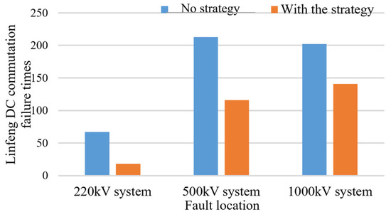 In the current Fufeng HVDC station, there is already a prediction step for commutation failure. Therefore, this paper considered multiple combinations. According to the simulation results, if the commutation failure prediction step is not activated, there are a total of 102 scenarios resulting in commutation failures. With only the original prediction step activated, there are 77 scenarios leading to commutation failures, including 6 additional scenarios. When both the original and the proposed prediction steps are activated, the scenarios causing commutation failures decrease to 58, with an additional 6 scenarios. Solely activating the proposed prediction step reduces the scenarios causing commutation failures to 64, with 4 additional scenarios. The simulation results for this scenario are shown in Figure 13. Through a comparative analysis, it is observed that solely activating the proposed prediction step reduces the occurrences of commutation failures in the Fufeng HVDC system by 37.3%. Hence, the commutation failure prediction step proposed in this paper exhibits a favorable effectiveness in the Fufeng HVDC project.