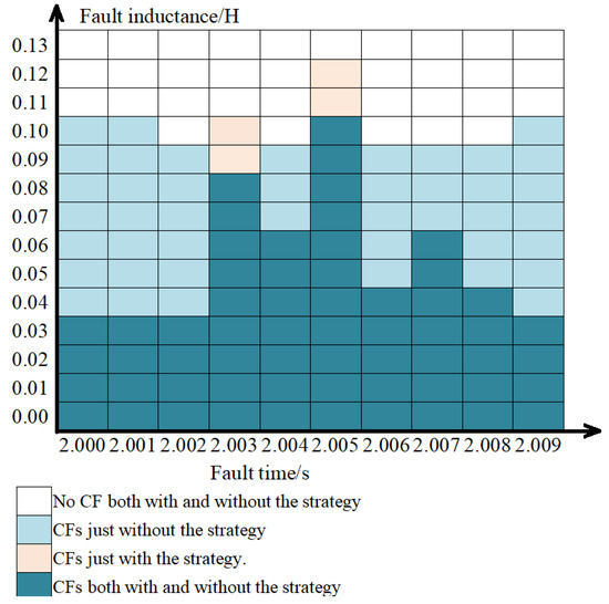 In the Linfeng HVDC transmission project, commutation failure incidents are more frequent, and faults in the 220 kV, 500 kV, and 1000 kV systems can potentially lead to commutation failures in the DC system. This study considered these three voltage levels separately during simulations. In the Linfeng HVDC transmission project, the start threshold of the prediction step is , with an upper limit of 0.25 and a lower limit of 0 for the amplitude. The DC current is at the rated current level. If the fault originates in the 220 kV system, the fault inductance ranges from 0.3 to 50.3 mH. For faults in the 500 kV system, the fault inductance ranges from 0.3 to 100.3 mH. For faults in the 1000 kV system, the fault inductance ranges from 0.3 to 800.3 mH. The overall simulation results are depicted in Figure 11. Figure 12 illustrates the simulation results specifically when the fault source is in Phase A of the 500 kV system.