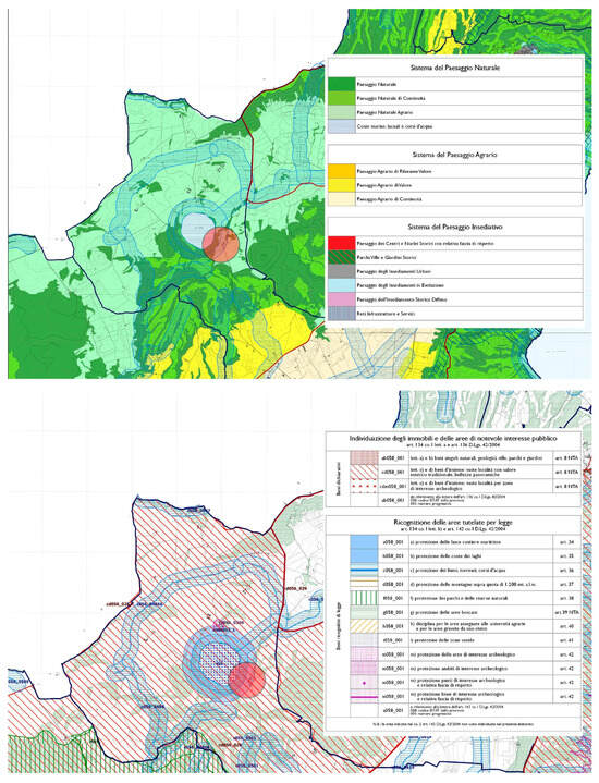 The document contains the combination of the regional PTPR Tables A (upper image) and B (below image) with the related declaration of significant public interest. In particular, the properties under study fall within the scope of the Agricultural Natural Landscape (Table A) and within the perimeter of the Collective Goods and Protection of Lakes (Table B)—Authors’ graphical elaboration. The source of the Table A is available online: https://www.regione.lazio.it/sites/default/files/ptpr-dc5-2021/04_tavole/tavole-a/tavola_a_2_333.pdf. The source of the Table B is available online: https://www.regione.lazio.it/sites/default/files/ptpr-dc5-2021/04_tavole/tavole-b/tavola_b_2_333.pdf.