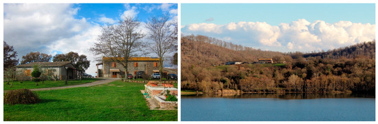 The centre of reflection underpinning the experimentation is provided by the Frà Viaco Agritourism, located in the northern area of Tuscia Viterbese (Italy), specifically in the municipality of Valentano, situated at the border between the Lazio and Tuscany regions. The farm in question comprises multiple manufacturing structures dating back to 1935, exhibiting typical characteristics of rural dwellings. It also includes two livestock buildings of recent construction (post-1967) for the company’s service and a last construction, longitudinally developed and resulting from the merging of two originally distinct bodies, currently employed as an agri-spa. These latter structures, subject to more recent building renovation, still date back to the first half of the twentieth century, at least for the residual parts that have been subsequently restored. More precisely, this agritourism complex is situated on the shores of Lake Mezzano, a volcanic basin of particular environmental value, already declared an area of notable public interest according to the Ministerial Decree of 22 May 1976 and consequently placed under protection (Figure 2).