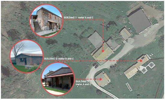 The agri-spa (Figure 4) analysed in this article is also located in the climatic zone E (2101 ≤ HDD ≤ 3000). The twentieth-century complex consists of several buildings with different functions: agritourism, a dependence with rooms, agri-spa, agricultural equipment storage, sheep stables, hayloft, chicken coop, warehouse, and a shed of farming vehicles. This research analyses the three main buildings where thermal and electrical systems are located, representing almost all energy consumption. These buildings (Figure 5) are agritourism (Building 1), dependence with guest rooms (Building 2), and the agri-spa (Building 3). The rural complex has two identical heating and domestic hot water systems, consisting of a condensing LPG boiler connected to a tank supplied by three thermal solar panels. Each system is connected to its meter: gas meter A supplies Buildings 1 and 2; gas meter B supplies Building 3. The complex has a single meter for electricity (meter C) that supplies all the buildings.