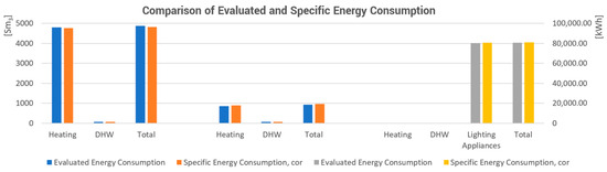 Table 4 and Figure 9 compare energy consumption measured under standard conditions [39] and consumption derived from analysing energy bills. The energy model is calibrated by incorporating the actual period during which buildings were utilised, the operational time of systems, and actual climatic data. This calibration is expressed through the correction factor. The difference between the initial energy model and the corrected one should be less than 5% to deem the analysis accurate [20].