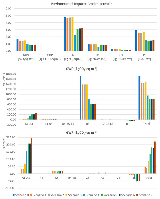 In the procedure outlined in this article, the following assumptions were made: the impact cycle related to materials stored in existing buildings was not assessed, as it does not affect choices regarding energy-efficiency measures; the operational phase of existing buildings was used as a baseline to evaluate intervention scenarios; and for each intervention scenario, the production and construction phase of materials or installed systems and operational and end-of-life stage (related to individual materials installed in each scenario) were assessed.