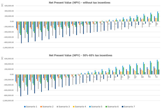 At the top, net present value (NPV) calculated without tax incentives for each scenario; at the bottom, net present value (NPV) calculated with the use of currently available tax incentives (50–65%) in Italy for each scenario—© Authors.
